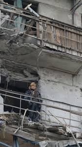امرأة على شرفة منزل قصفه الجيش الأوكراني