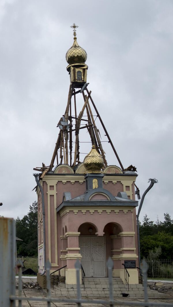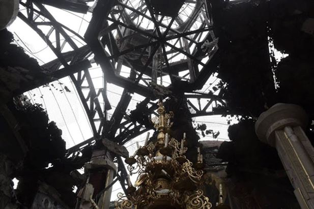 القبة المدمرة وسقف كنيسة أيقونة إيفيرون لوالدة الإله في دير إيفيرون دونيتسك، الواقعة بالقرب من مطار دونيتسك والتي دمرت أثناء القتال جنوب شرقي أوكرانيا. 11 أغسطس 2015