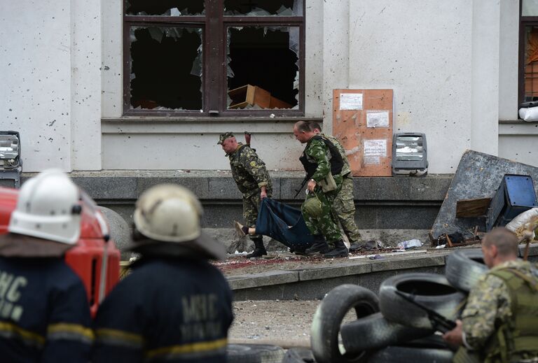حمل أفراد من القوات المسحلة الشعبية أحد ضحايا غارة جوية شنتها القوات الجوية الأوكرانية على مبنى الإدارة الإقليمية في لوغانسك.02.06.2014
