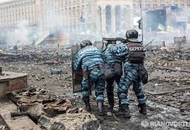 يظهر رجال الشرطة في ساحة “ميدان نيزاليجنوستي” في كييف، حيث بدأت الاشتباكات بين المتظاهرين والشرطة. 19 فبراير 2014
