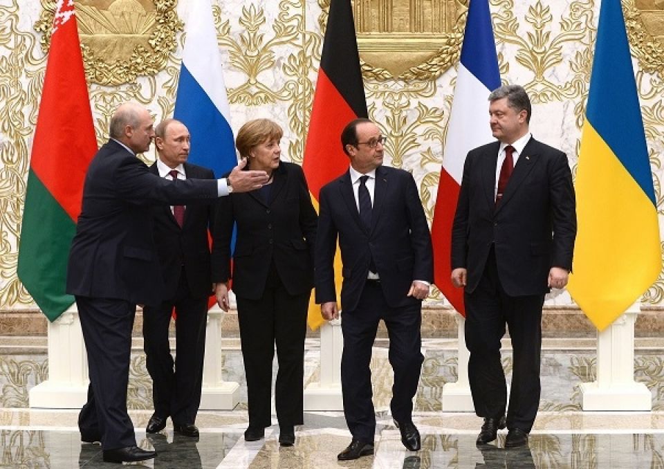 الرئيس البيلاروسي ألكسندر لوكاشينكو، ونظيره الروسي فلاديمير بوتين، والمستشارة الألمانية السابقة أنغيلا ميركل، والرئيس الفرنسي السابق فرانسوا هولاند، والرئيس الأوكراني السابق بيترو بوروشينكو، خلال اجتماع يهدف إلى إنهاء عشرة أشهر من القتال في أوكرانيا. 11 فبراير 2015