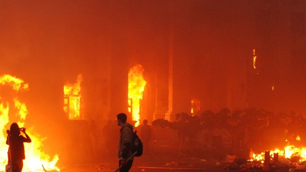 حريق في مبنى نقابة العمال في أوديسا (المدخل المركزي مشتعل)