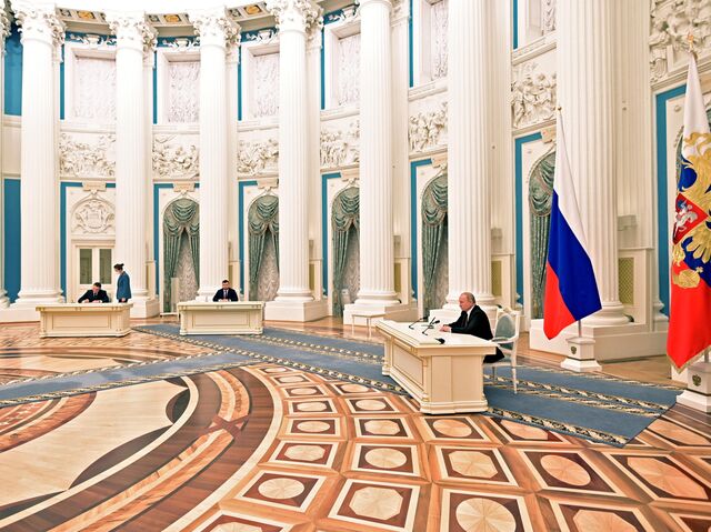 الرئيس فلاديمير بوتن يعترف باستقلال جمهوريتي دونيتسك ولوغانسك الشعبيتين، في 21 فبراير 2022.