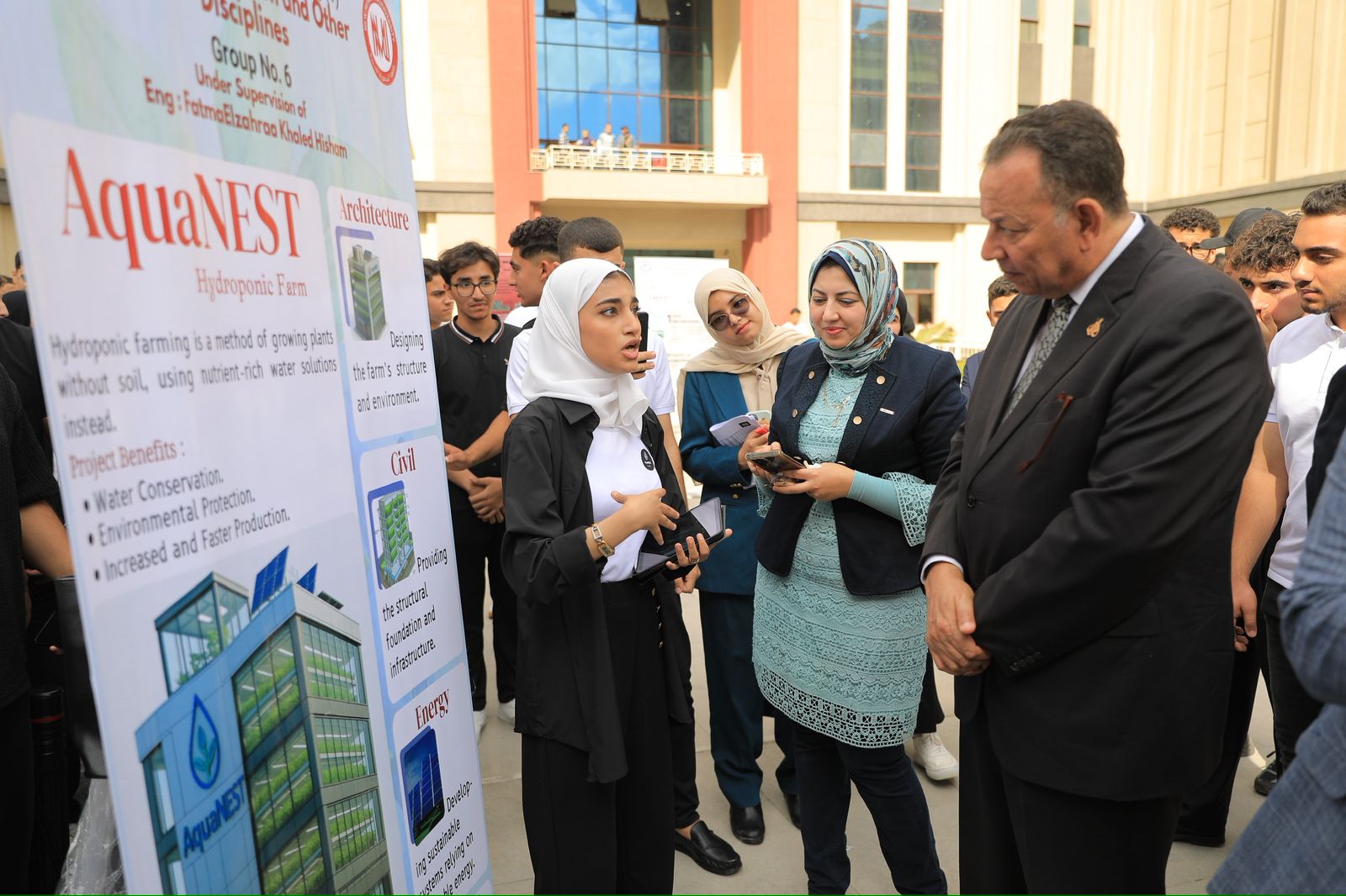 وفي ختام الفعالية، أشاد الأستاذ الدكتور معوض الخولي رئيس الجامعة عن فخره بجهود طلاب كلية الهندسة ومشرفيهم، مشيدًا بروحهم الإبداعية وتميّزهم العلمي، مؤكدًا أن هذا الحدث يمثل سابقة جديدة في تاريخ كليات الهندسة المصرية، و تحولًا نوعيًا في مسار التعليم الهندسي حيث تُعد المرة الأولى التي تُناقش فيها مشاريع التخرج من خلال لجان تحكيم مشتركة تشمل جميع البرامج الهندسية، معتبرًا ذلك نقطة انطلاق نحو تطوير منظومة التعليم وإعداد خريج قادر على الإبداع والتكامل مع مختلف التخصصات.