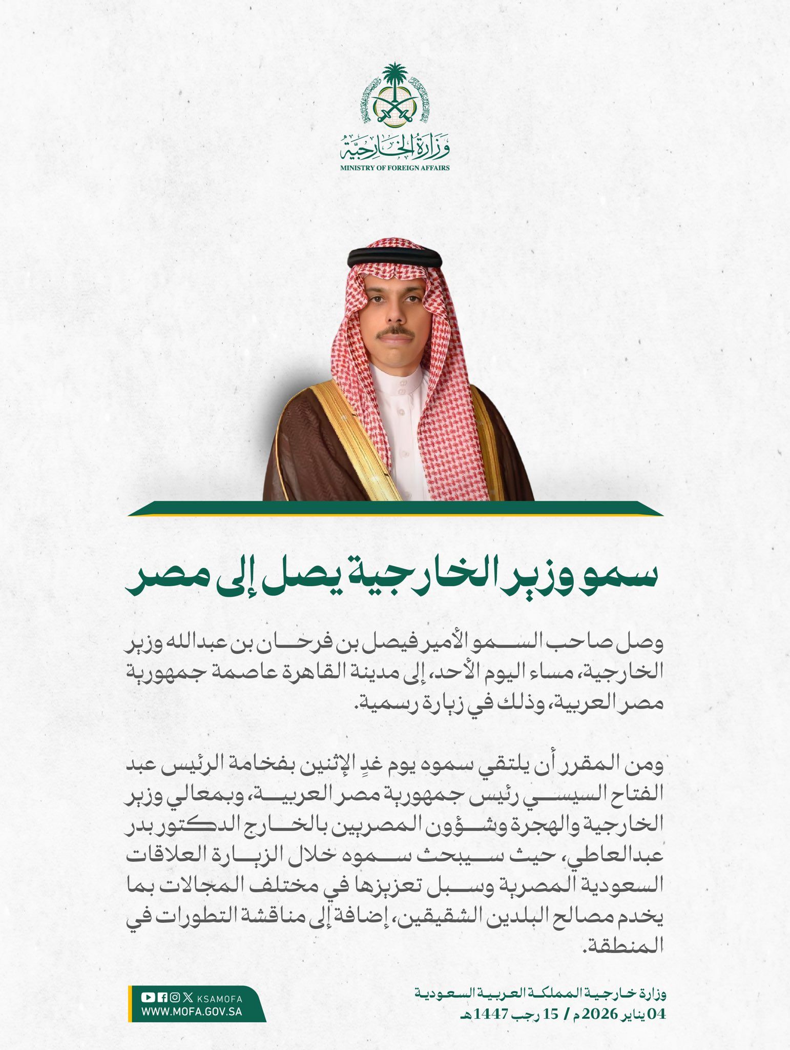 وبحسب بيان للخارجية السعودية، من المقرر أن يلتقي الوزير فيصل بن فرحان غدٍ الاثنين مع الرئيس عبد الفتاح السيسي، ووزير الخارجية الدكتور بدر عبدالعاطي.