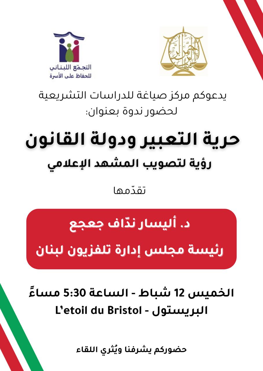 يعقد، غدا الخميس في تمام الساعة 3.30 مساء، مركز صياغة للدراسات التشريعية بالتعاون مع التجمع اللبناني للحفاظ على الأسرة ندوة بعنوان: “حرية التعبير ودولة القانون: رؤية لتصويب المشهد الإعلامي”.