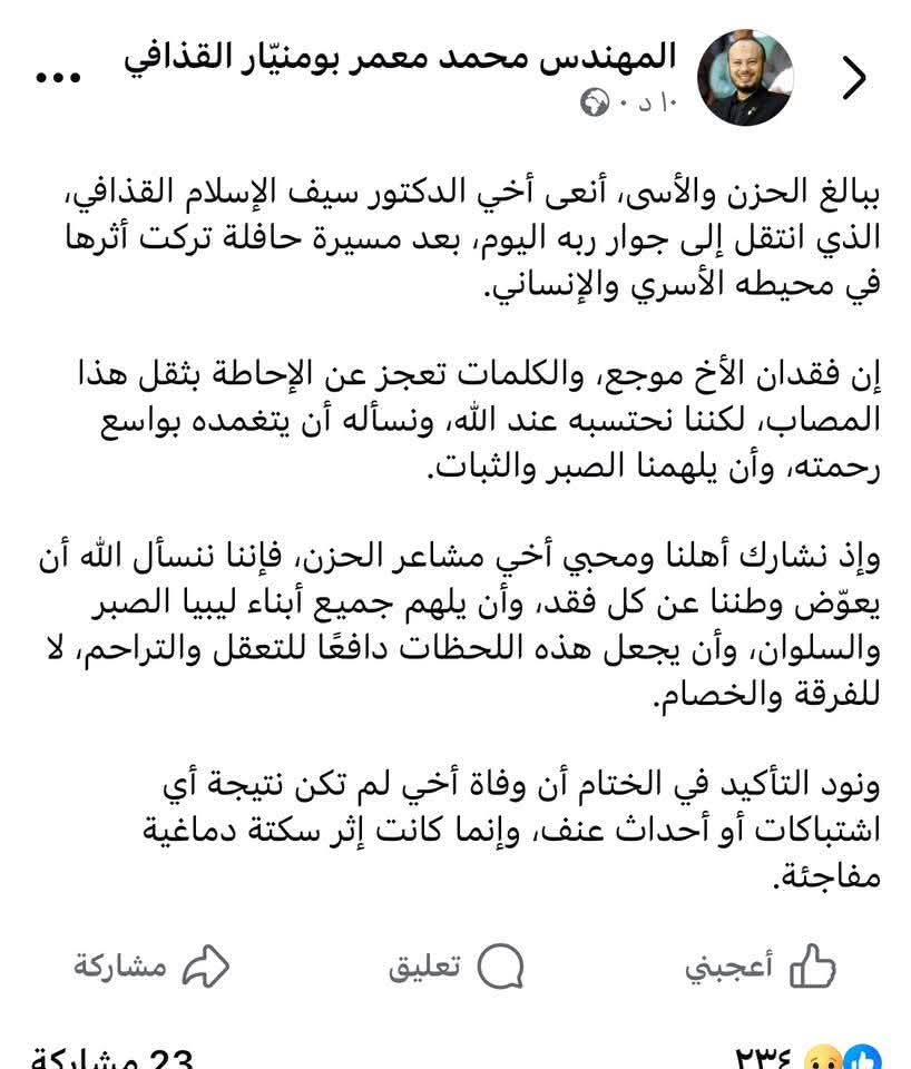 هذا، ونعى المهندس محمد معمر القذافي شقيقه سيف الإسلام القذافي، على حسابه الخاص على موقع التواصل الاجتماعي “فيسبوك”، قائلا: “ببالغ الحزن والأسى، أنعى أخي الدكتور سيف الإسلام القذافي، الذي انتقل إلى جوار ربه اليوم،بعد مسيرة حافلة تركت أثرها في محيطه الأسري والإنساني”.
