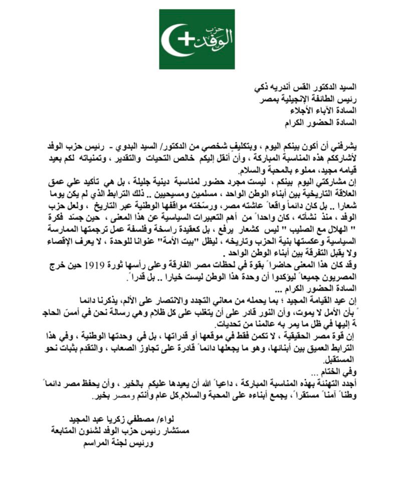 توجه ظهر اليوم اللواء مصطفى زكريا مساعد رئيس حزب الوفد إلى مقر الكنيسة الإنجيلية بمصر الجديدة، نيابة عن الدكتور السيد البدوي، رئيس حزب الوفد، وذلك لتقديم التهنئة بعيد القيامة المجيد.
