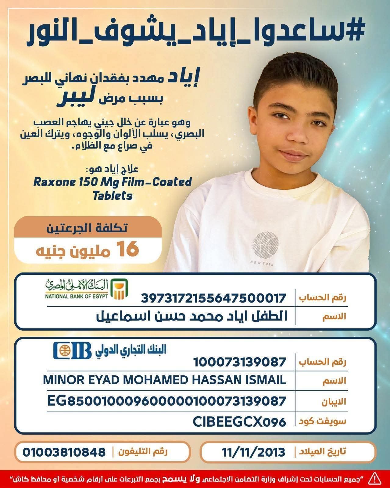 قام أهالي مدينة ومركز بيلا بمحافظة كفر الشيخ بحملة شعبية كبرى بالدعم الإنساني والتبرع المالي لإنقاذ الطفل إياد محمد حسن من مرض نادر بالعين يصيب العصب البصري ساحبا النور من العين تدريجيا، ما يجعل إياد يصراع الظلام.