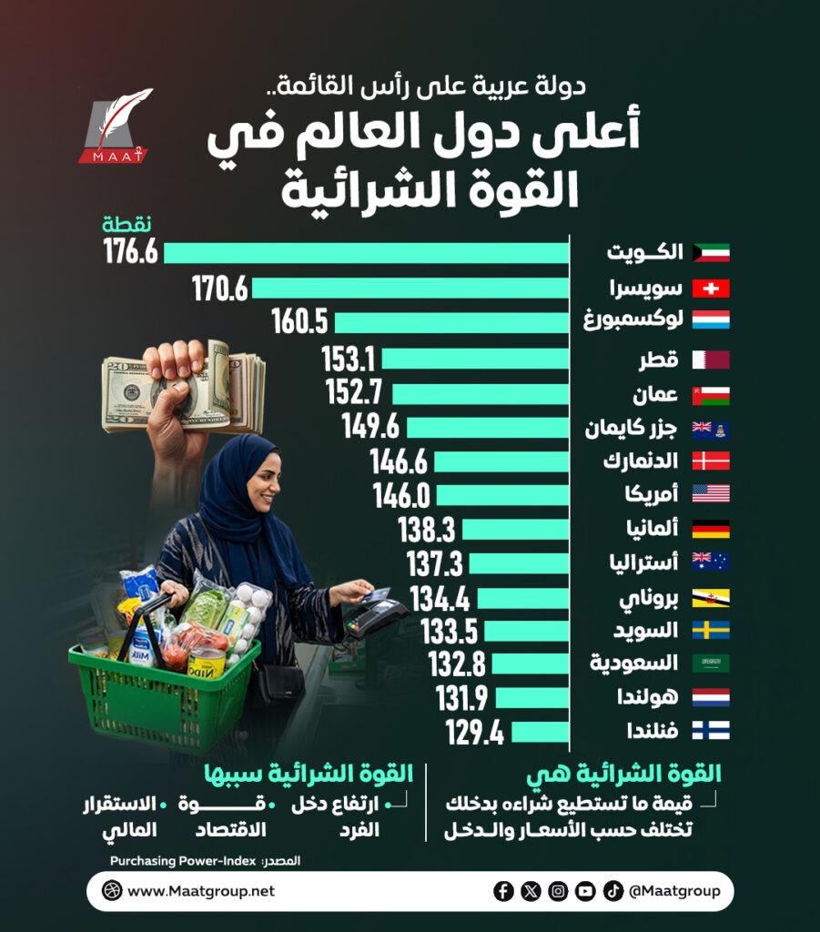 في مفاجأة اقتصادية، تصدرت دولة الكويت قائمة دول العالم في مؤشر القوة الشرائية، مسجلة 176.6 نقطة، لتتفوق بذلك على قوى اقتصادية تقليدية ومراكز مالية عالمية.